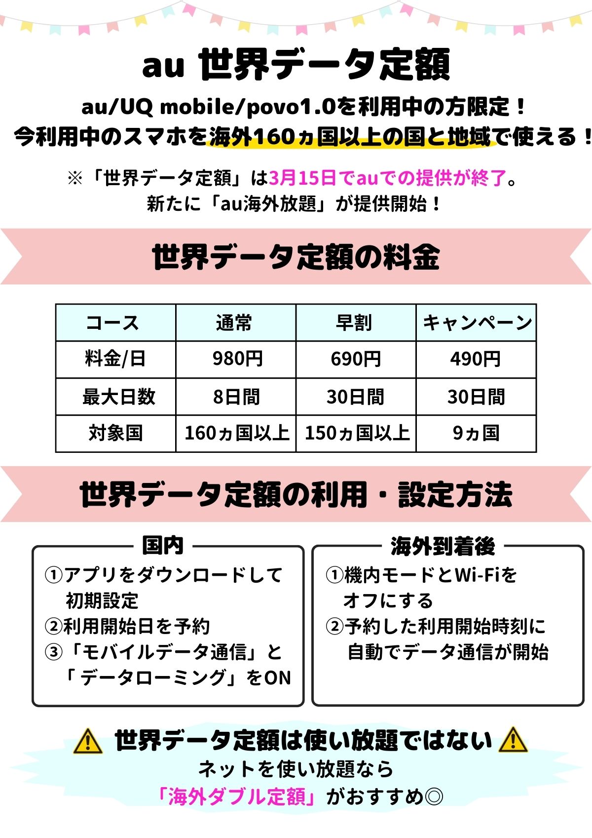 Auの世界データ定額のメリットは、以下の通りです。