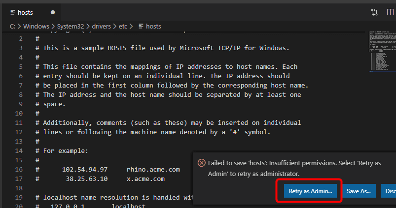 hostsファイルを開いたら、VSCodeのエディターで編集することができます。VSCodeのメリットは、hostsファイルを編集する際に、管理者権限が必要ない点です。