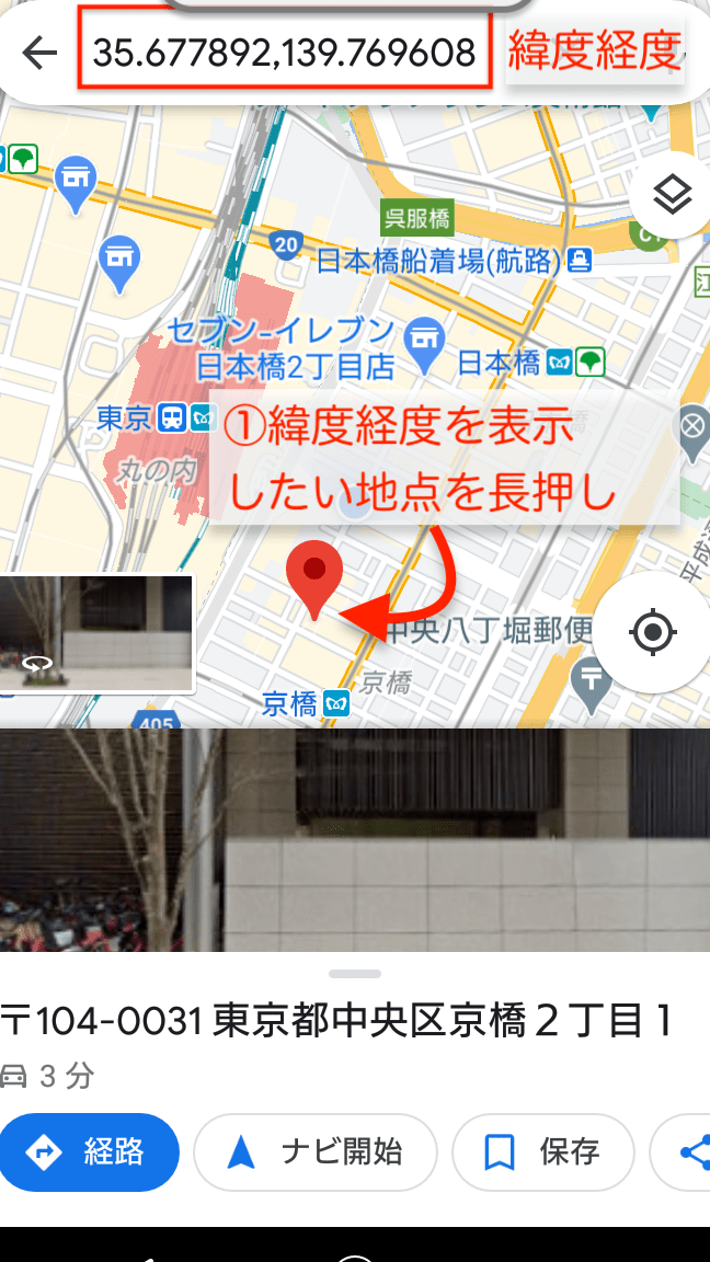 Android版Googleマップで、指定した場所が表示されたら、長押しタップします。この操作で、Googleマップが経度・緯度を表示します。
