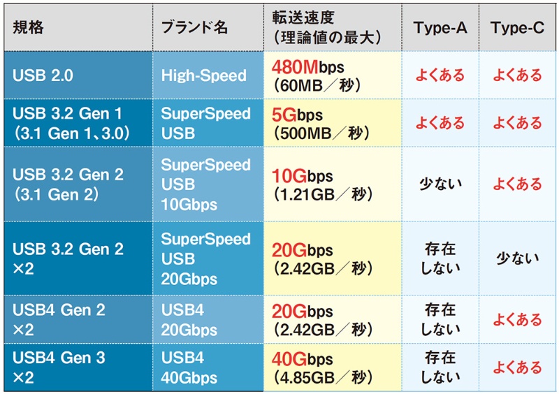 USBのデータ転送速度は、時代とともに急速に高速化している。USB4やUSB3.2 Gen2など、高速なデータ転送速度を実現する規格が登場している。しかしながら、ロゴ名や表記について混同しがちであるため、本稿ではデータ転送速度とロゴ名・表記などの対応表を整理し、明確化する。