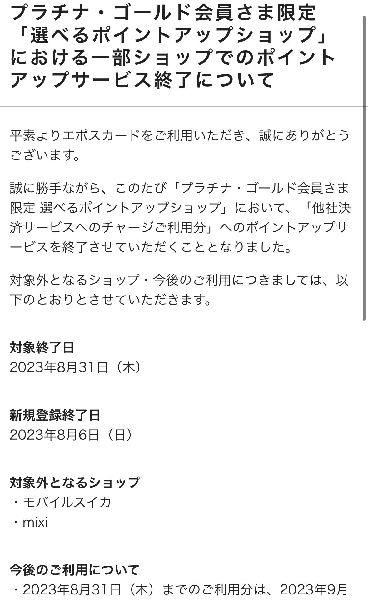 エポスカードの改悪について、mixiとモバイルSuicaがポイントアップ対象から外れたのはなぜですか?
