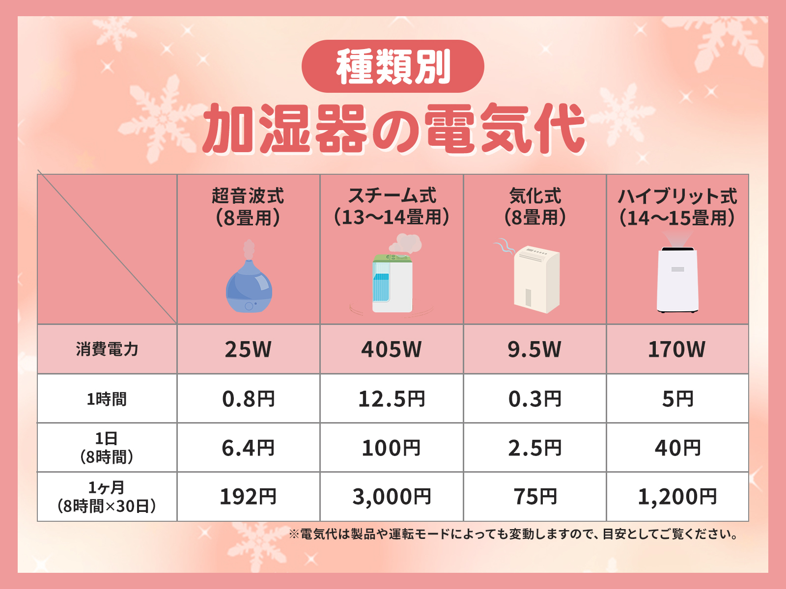 - 使用時間: スチーム加湿器の使用時間が長いほど、電気代が高くなります。