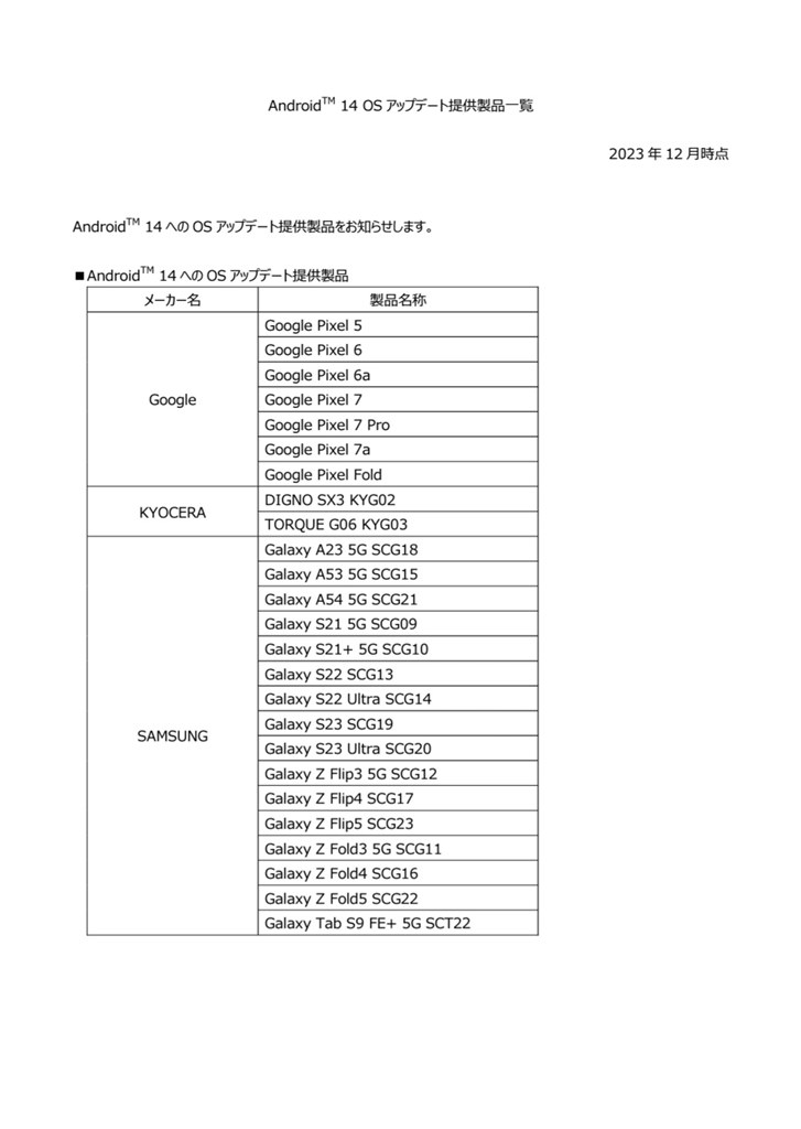 Android 14アップデートの対象機種