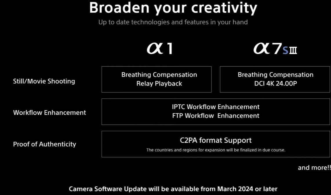 ソニー、α7 SIII、α1をブリージング補正やC2PAに対応予定。2024年3月以降にアップデート